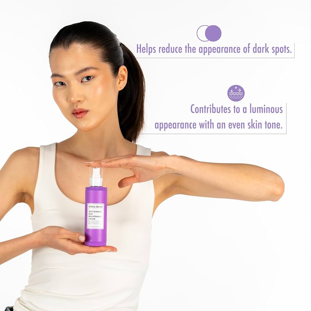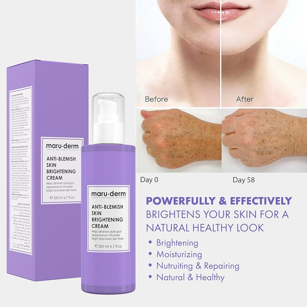 کرم maru.derm ANTI-BLEMISH SKIN BRIGHTENING CREAM در بستهبندی ۲۰۰ میلیلیتری عرضه شده و برای استفاده روزانه طراحی گردیده است. این محصول با هدف کاهش لکهای تیره، یکنواختسازی رنگ پوست و افزایش شفافیت آن تولید شده و برای انواع پوست، بهویژه پوستهای دارای لک و تیرگی، مناسب است.