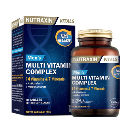 Nutraxin Vitals Men's Multi Vitamin Complex مکملی تخصصی برای آقایان است که شامل ۱۴ ویتامین، ۷ ماده معدنی، آنتیاکسیدانها و عصارههای گیاهی میباشد. این محصول با فناوری آزادسازی تدریجی، جذب بهتر و اثر طولانیتری دارد. ترکیبات آن به تقویت انرژی، سلامت قلب، سیستم ایمنی و تعادل هورمونی کمک میکنند. فاقد گلوتن و شکر بوده و در بستهبندی ۶۰ عددی توسط Biota Laboratories تولید شده است.